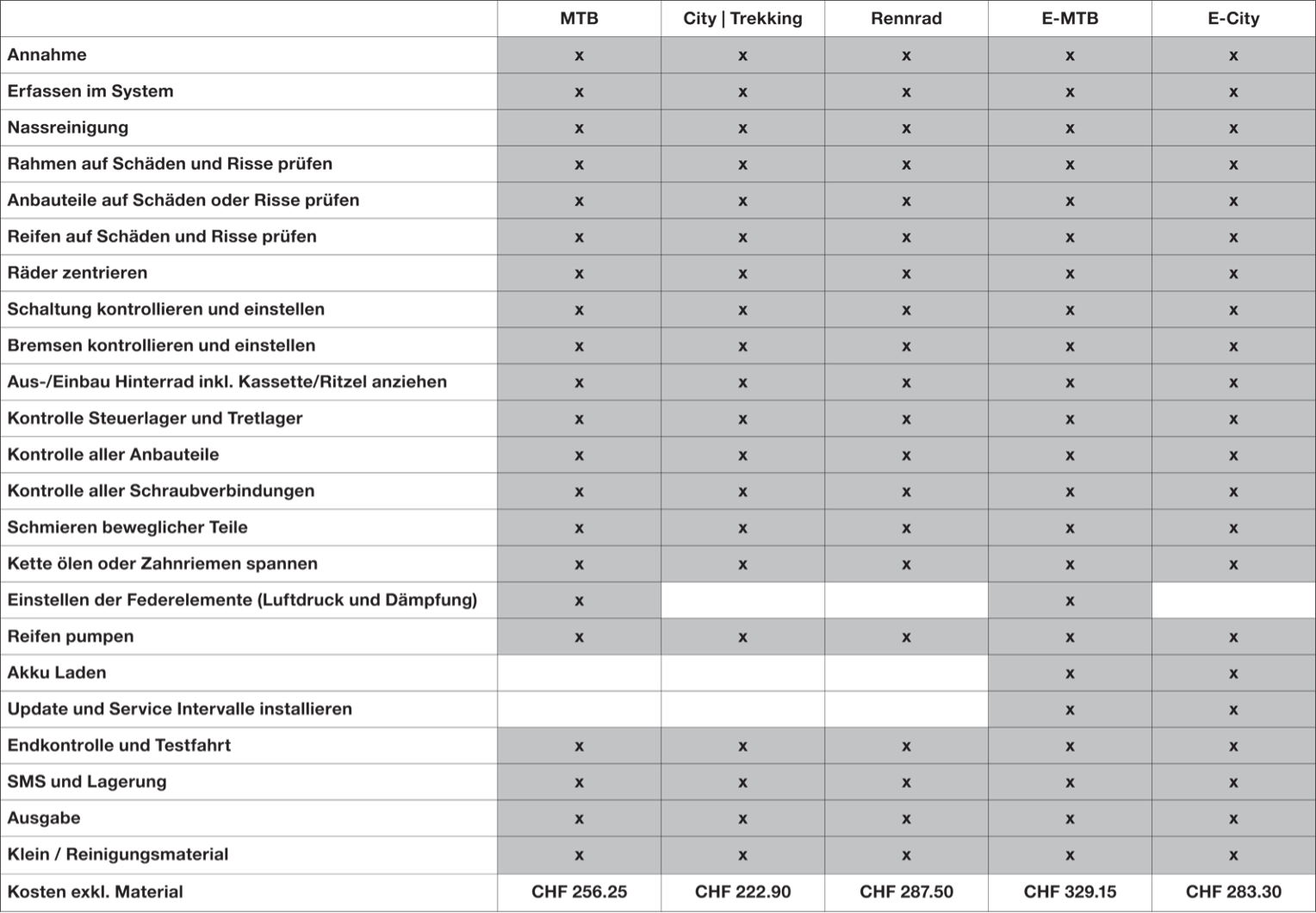 Übersicht alle Tarife und Leistungen von Thomet Radsport.